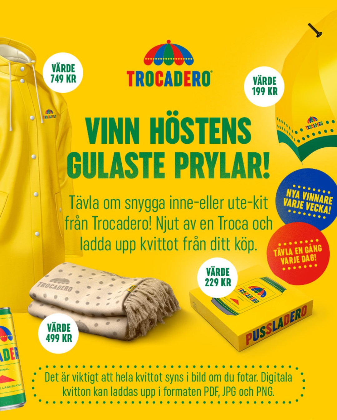 Tävla med Trocadero. Skanna kvitton frÃ¥n inköp av Trocadero. Varje vecka utses 10 vinnare som vinner antingen:1 inne-kit innehÃ¥llande jaquardpläd och Trocapussel eller1 ute-kit innehÃ¥llande paraply och regnjacka frÃ¥n Tretorn. 60 st Fullvärdeskuponger för Trocadero 50cl skickas ut dagligen. Detta sk... Läs mer