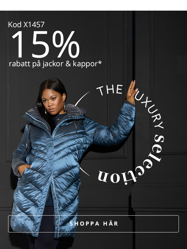 Koden X1457 ger 15% rabatt på jackor & kappor. Minsta ordervärde är 469 kr. Gäller endast på utvalda produkter som finns i lager. Erbjudandet kan inte kombineras med andra rabatter eller erbjudanden. Koden kan lösas in två gånger per person online eller via telefon.