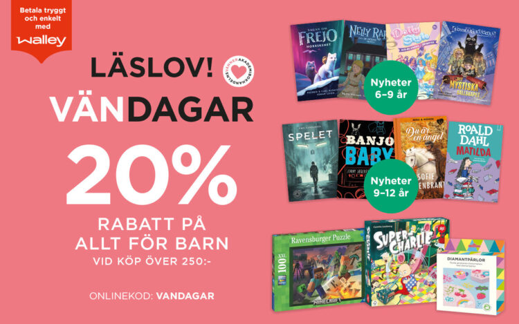 Akademibokhandeln firar in Läslovet med 20% rabatt på allt för barn när du handlar för minst 250 kr. Uppge onlinekod VANDAGAR om du handlar online så dras rabatten av automatiskt. Rabatten gäller endast barnsortiment i butik och online, för dig som är eller blir medlem. Gäller på ordinarie priser och kan inte kombineras med andra…