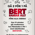 Koden BERT2FOR1 ger 2 biobiljetter till priset av 1 till "Bert sabbar allt". Gäller för visningar den 19 oktober och för dig som är eller blir medlem hos Filmstaden. Mellanpopcorn ingår också på köpet.