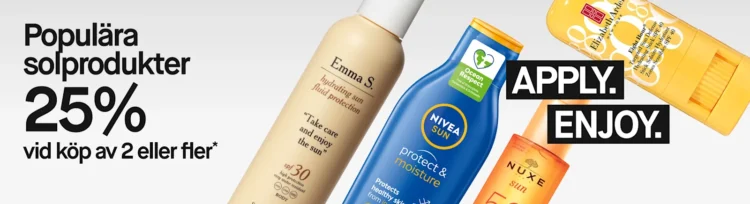 Få 25% rabatt på populära solprodukter. Gäller vid köp av 2 eller fler, i butik, på kicks.se och i appen.. Gäller b.tan, Decubal, Elizabeth Arden, Emma S., Hello Sunday, Ida Warg, NIVEA, NUXE, Rudolph Care, Gäller ej Nice Price-produkter.