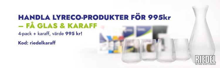 Kod som vid köp av produkter från Lyrecos eget märke för minst 995 kr ger glas och karaff från Riedel värde 995 kr på köpet.