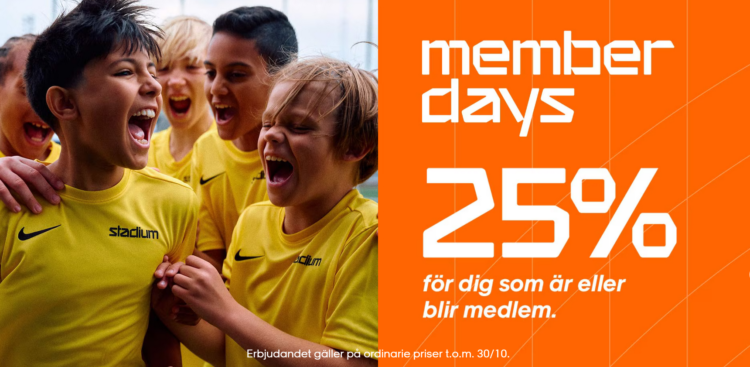 Stadium bjuder på medlemsdagar med 25% rabatt för dig som är eller blir klubbmedlem. Erbjudandet gäller på ordinarie priser t.o.m. 30/10.
