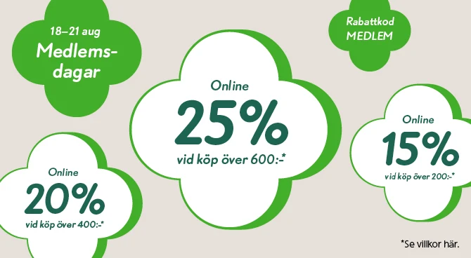 Medlemsdagar på Apoteket. Online den 18-21 augusti erbjuder Apoteket förmånliga rabatter med upp till 25% på ett köp. Gäller ej receptbelagda läkemedel, presentkort eller tjänster.