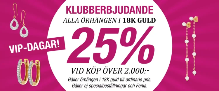 Guldfynd bjuder på VIP-dagar med bl.a rabattstege och 25% rabatt på alla örhängen i guld. De firar även med tävlingar, roliga aktiviteter i butikerna och en festlig stämning.
